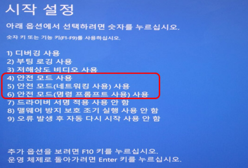 이후로는재부팅이 되면서 안전모드로 진입을 하게 됩니다. 안전모드는 일반적인 윈도우와는 완전히 다릅니다. 그래픽 드라이버도 설치가 되어 있지 않기 때문에 많이 어색할것입니다. 어쩐경우에는 키보드나 마우스를 이용할수 없을수도 있습니다.