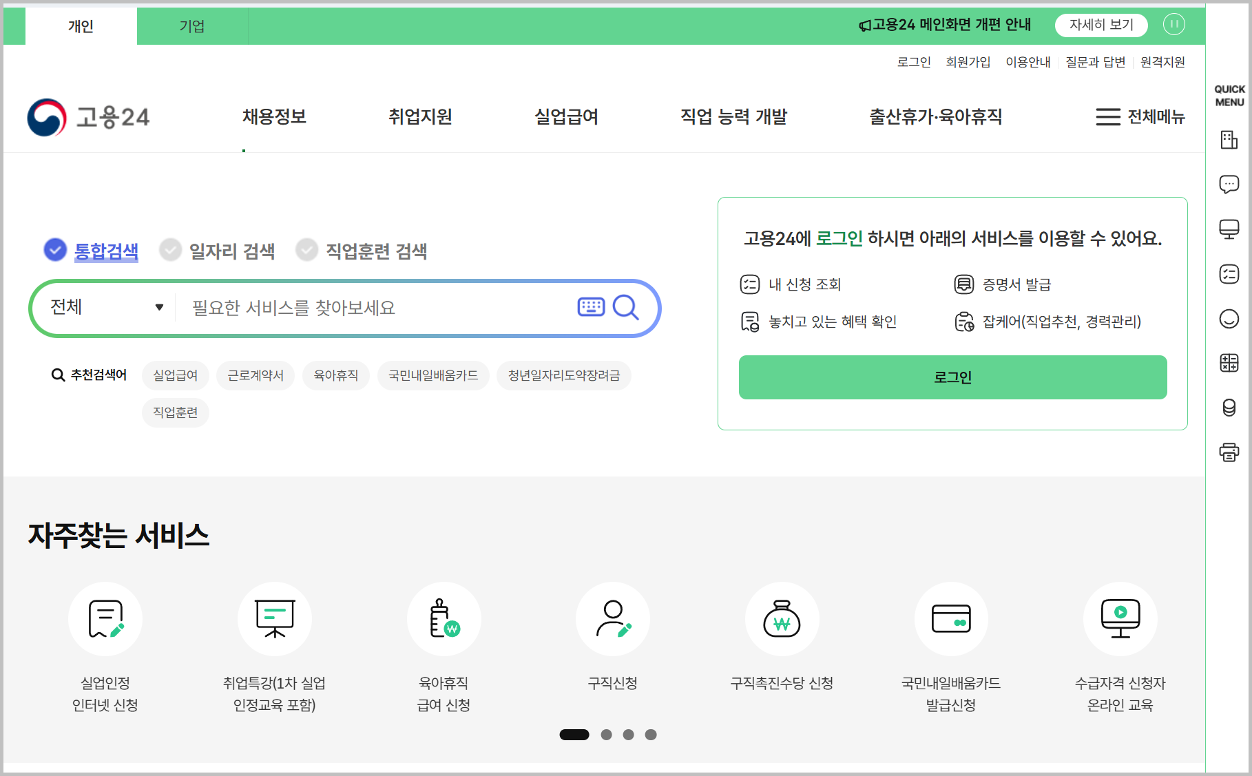 2024년 9월, 고용노동부는 기존 워크넷(Worknet)을 포함한 9개의 고용 관련 서비스를 고용24 통합포털로 일원화했습니다. 이 통합을 통해 구직자와 기업은 이력서 등록, 실업급여 신청, 훈련 과정 등록, 고용보험 관련 민원 처리 등을 한 번에 처리할 수 있게 되었지요.