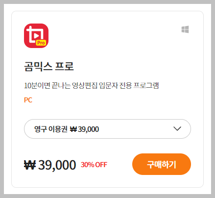 곰믹스 프로의 가격은 그렇기 비싸지는 않습니다. 요즘에는 편집프로그램을 구독해서 사용하는 경우가 많은데, 곰믹스 프로의 경우에는 구독제가 아니라 영구이용권의 형태입니다. 한번 구매를 하면 계속 사용할수 있는 시스템입니다.