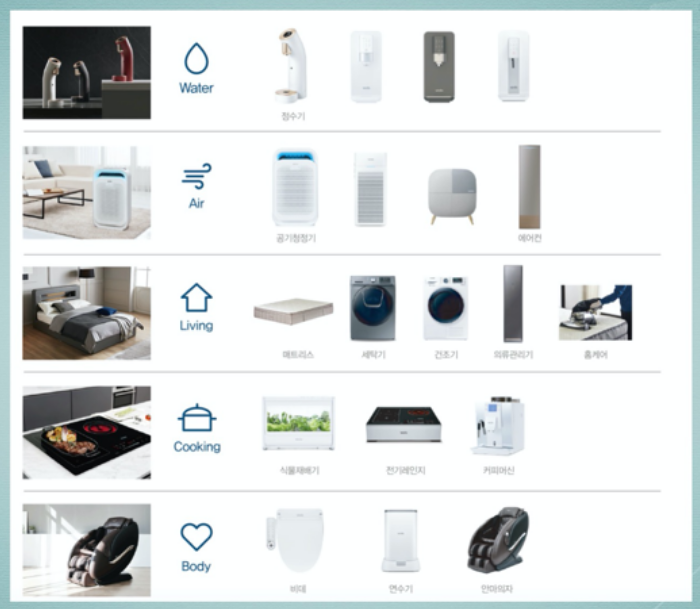 교원 그룹은 유명한 학습지인 '구몬'을 운영하는 회사입니다. 교원 그룹은 렌탈 전문업체도 운영하며, 여기서 소개할 웰스(Wells)는 그 중 하나입니다. 교원 프라퍼티에 속하는 웰스는 정수기 · 공기청정기 등의 건강가전 종합브랜드라고 할 수 있습니다.