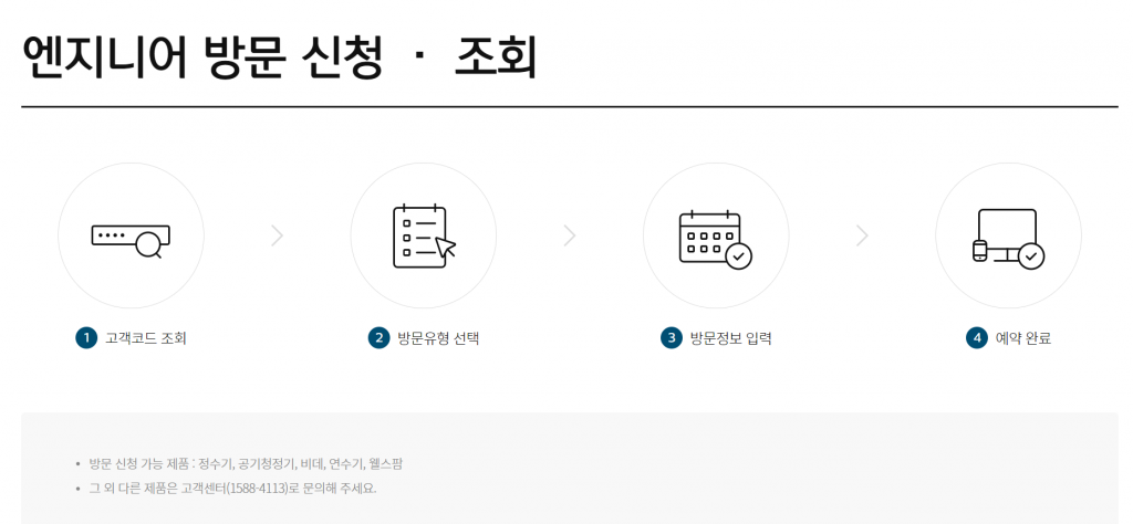 링크를 통해 홈페이지에 접속하면 위와같은 화면을 볼 수 있습니다. 다만 방문이 가능한 제품은 정수기, 공기청정기, 비데, 연수기, 웰스팜으로 한정되어 있기 때문에 그 외의 상품에 대한 AS는 고객센터로 문의해야 합니다.