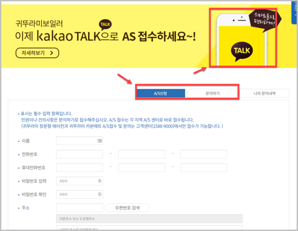 여러 이유로 전화로 A/S 접수가 곤란한 사람은 홈페이지에서 A/S 접수를 할 수 있습니다.아래 링크를 클릭하면 A/S 신청 화면으로 이동할 수 있습니다.