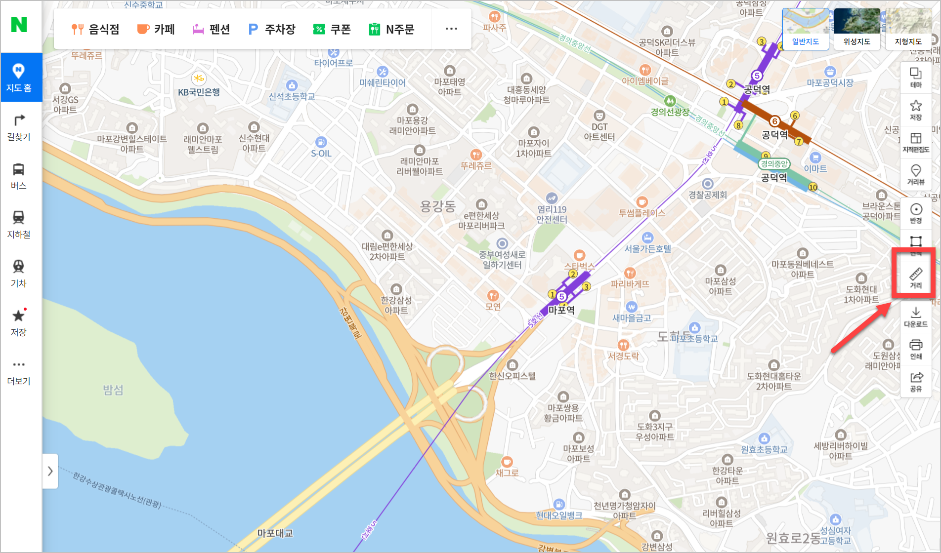 네이버 지도의 오른쪽을 보면 '거리'라고 되어 있는 아이콘이 있습니다. 이것을 클릭하시면 직선거리를 측정할수 있습니다. 다만 명심해야 할 것이 있습니다. 이 거리는 직선 거리이기 때문에 실제 이동 거리와는 차이가 있을수 밖에 없습니다. 이동거리를 파악하기 위해서는 네이버 길찾기를 이용하길 권해드립니다.