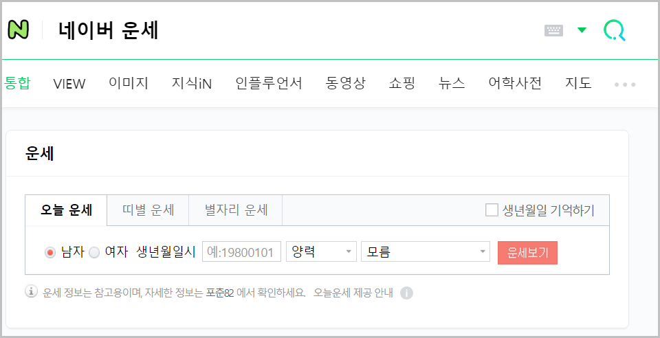 네이버 검색창에서 간단하게 '네이버 운세'라고 검색을 하시면 위와 같이 나옵니다.