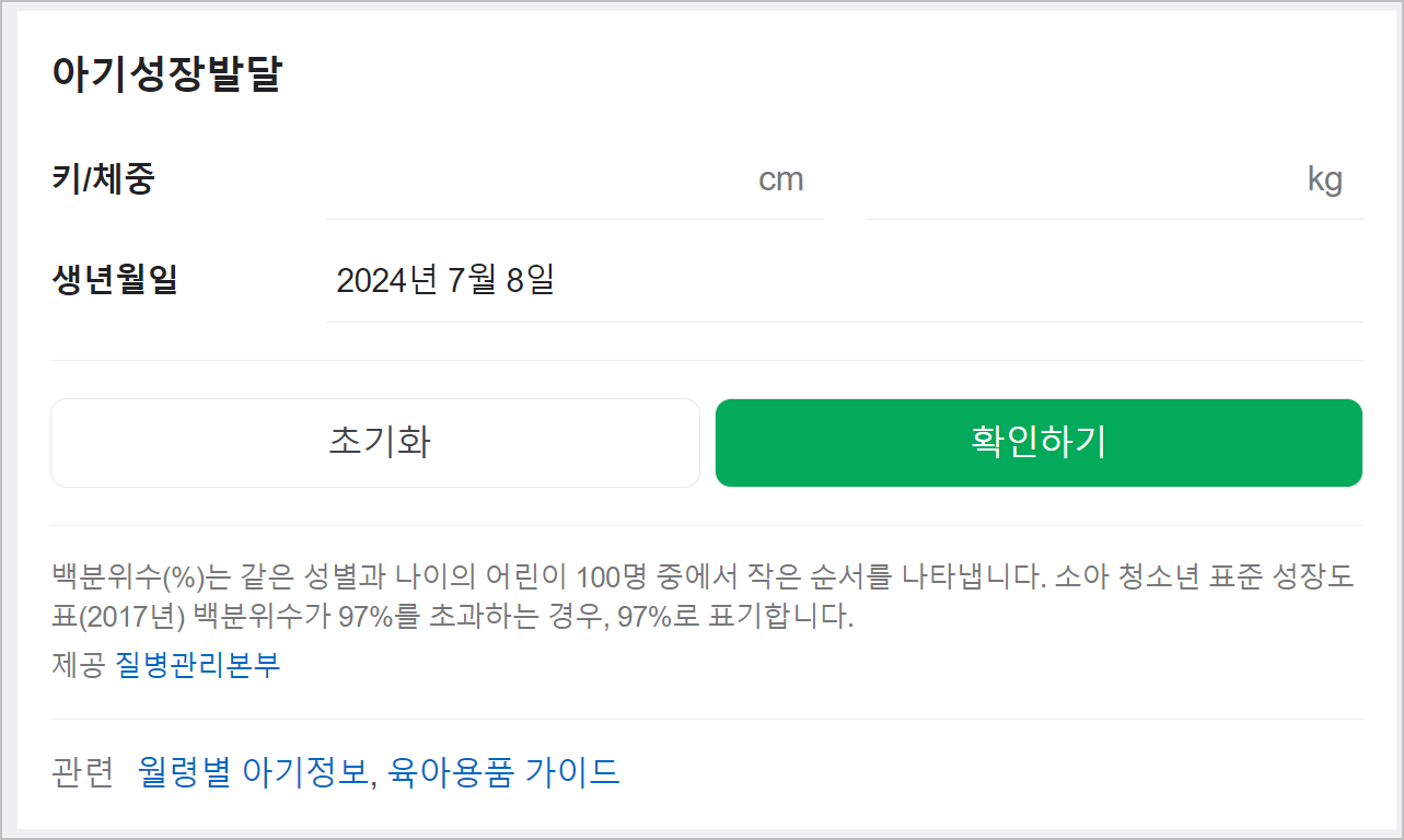 그래서 저같은 경우에는 네이버 영유아발달계산기를 활용합니다. 간단하게 이용이 가능한게 장점입니다.