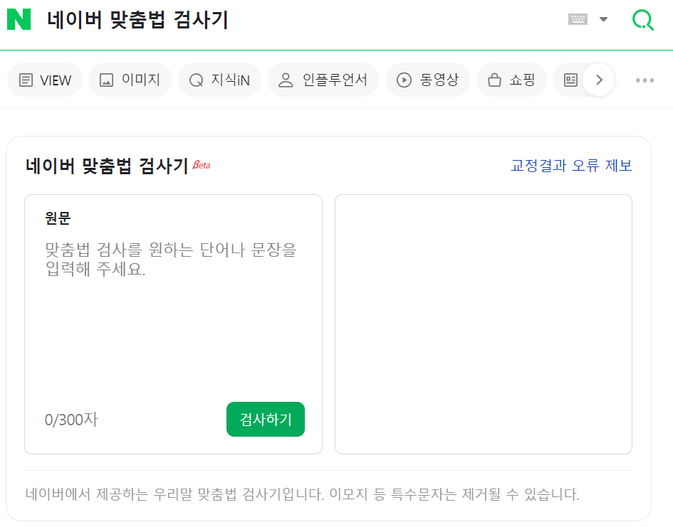 네이버 맞춤법 검사기를 사용하려면 위 사진과 같이 검색하면 쉽게 접속할 수 있습니다. 이 접근성 덕분에 많은 사람들이 쓰는 것 같습니다.