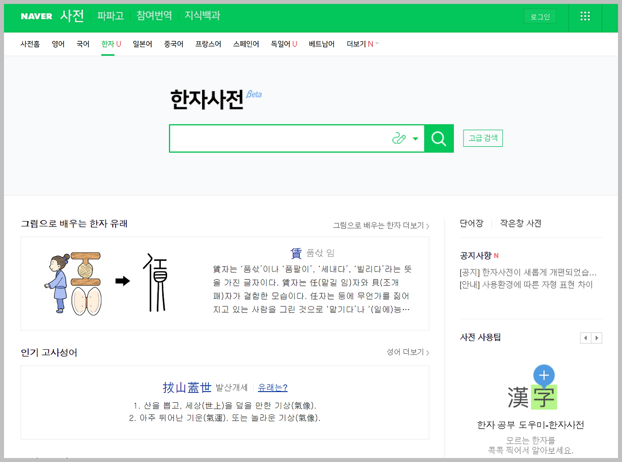 대표적으로 많이 알려진 것이 네이버 한자사전입니다. 흔히 네이버 한문 번역기라고 부르기도 합니다. 글자를 직접 마우스나 손으로 입력하면 해당 한자의 음과 뜻을 확인할 수 있어 편리합니다. 예전보다 화면 구성도 정돈되어 사용하기가 한결 수월해졌습니다. 다만 긴 문장을 한 번에 번역하는 기능은 제한적이어서, 결국 한 글자씩 확인해야 하는 번거로움이 있습니다.