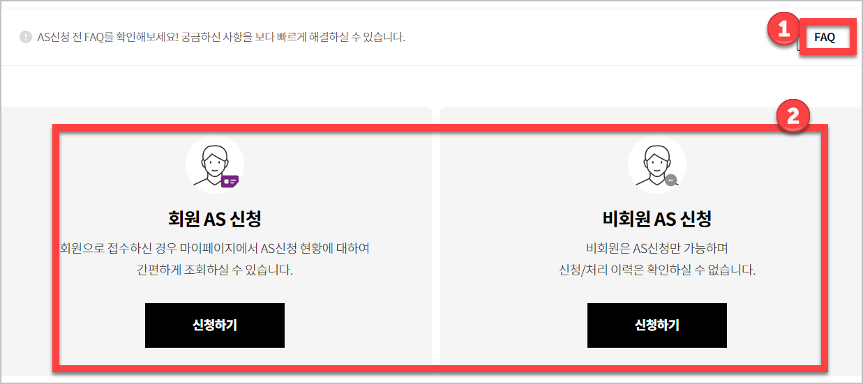 여기로 들어가시면 A/S신청을 하실수 있는 항목이 나오게 됩니다.