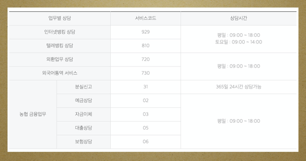 위 표는 업무별 서비스 코드와 상담 시간을 보여줍니다. 위에서 언급한 연락처로 전화하면 서비스 코드를 알고 있다면 빠르게 상담이 가능합니다.