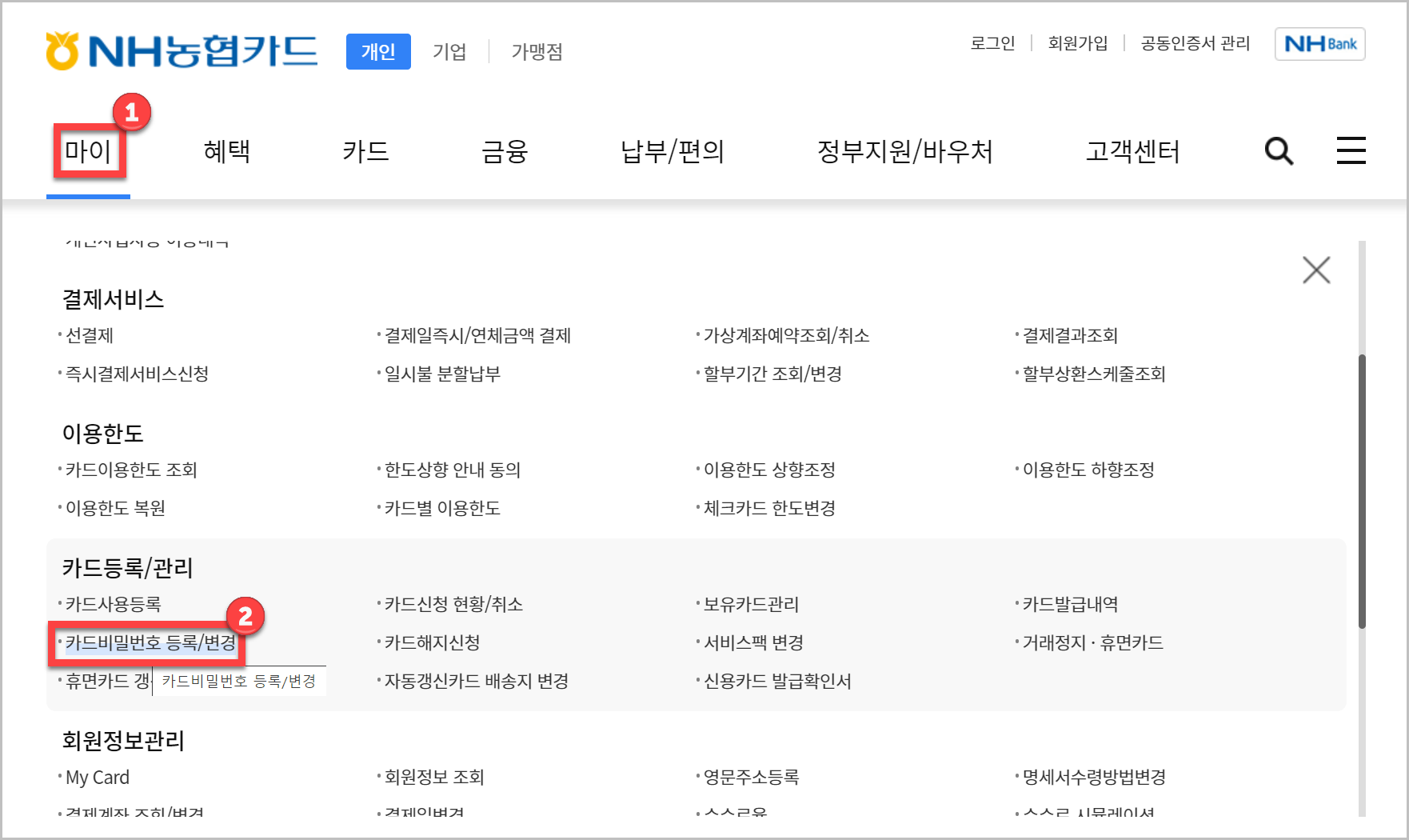 2. 로그인을 하고 나서 홈페이지에 들어가면 이런 모습입니다. 여기에서 메뉴를 집중해 주세요. 1) 마이 2) 카드비밀번호 이렇게 들어가시면 됩니다.