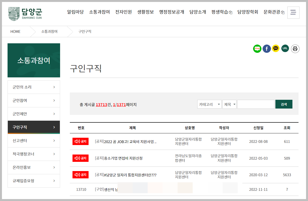담양군청 구인구직 게시판에 들어가기 위해서는 복잡하게 들어가야합니다. 지자체 홈페이지는 되게 복잡합니다. 그래서 한참걸릴수도 있습니다.