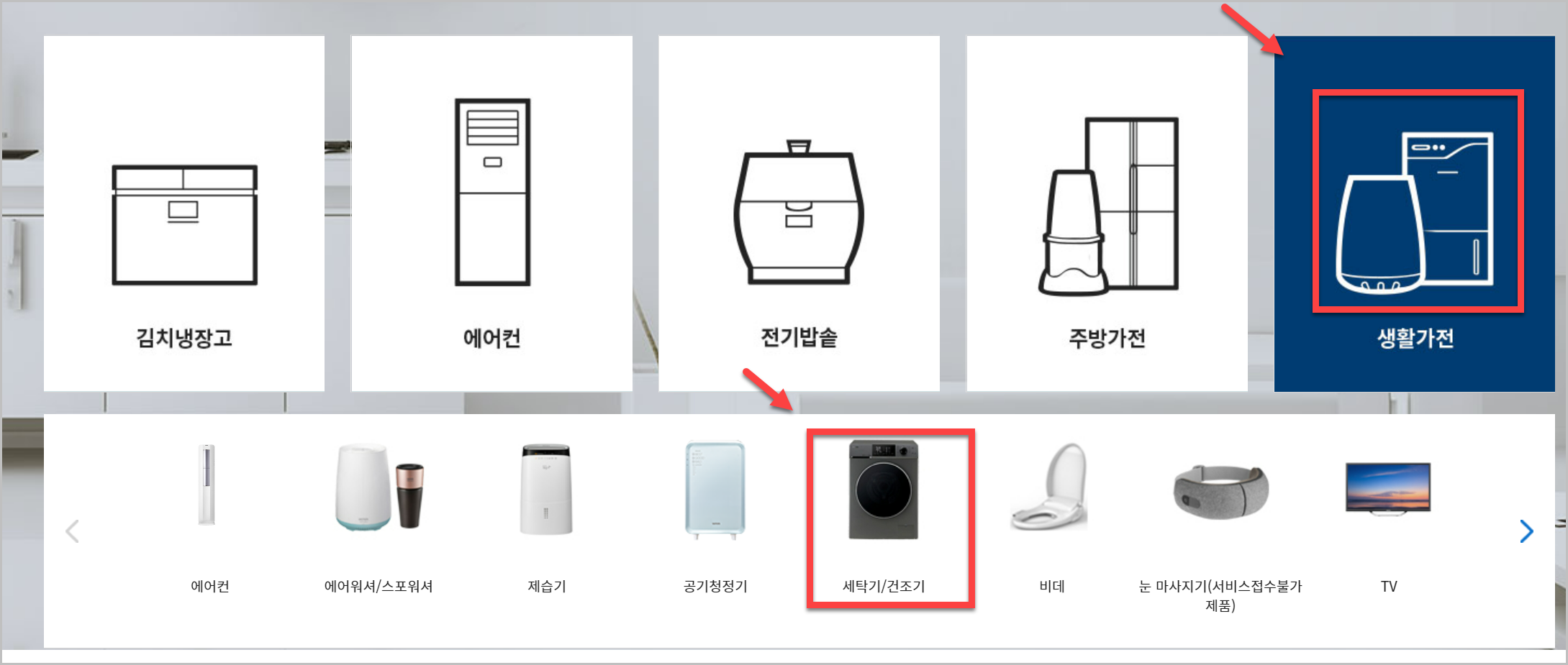 홈페이지에 들어가면 이런 화면이 나옵니다. 다양한 문제에 대한 기본적인 해결이 가능하도록 되어있습니다. 생활가전을 누르고, 세탁기를 누르시면 쉽게 원하는 것을 확인할 수 있습니다. 이곳에서 해결이 되지 않는다면 전화번호로 서비스센터에 연락을 하셔야 겠지요.