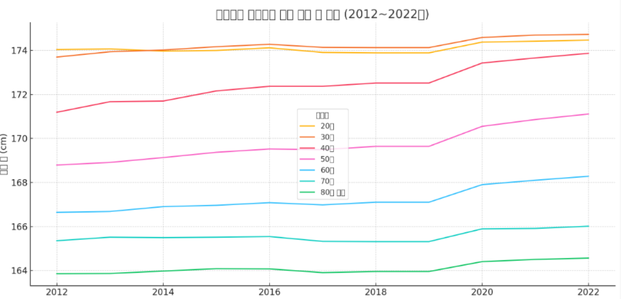 제가 속해있는 40대 남성의 신장 역시 꽤나 커졌습니다. 40대 남성의 신장은 2012년 170.88cm에서 2022년 173.53cm로 꽤 큰 폭의 상승을 보였습니다. 이는 현재의 40대가 이전 세대보다 평균적으로 키가 더 컸던 30대에서 올라온 세대이기 때문에 나타난 결과입니다.