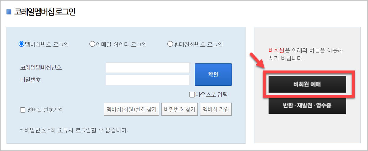3) 로그인을 하시면 됩니다. 과거에는 코레일 멤버십 번호가 없었으면 예약이 안되는 경우도 있었습니다만, 요즘에는 그런일은 없습니다. 비회원으로도 됩니다. 비회원의 경우에는 마일리지가 쌓이지 않는다는 아쉬운점만 있을 뿐입니다. 사실 자주 이용하지 않는경우에는 아무 의미가 없지요.