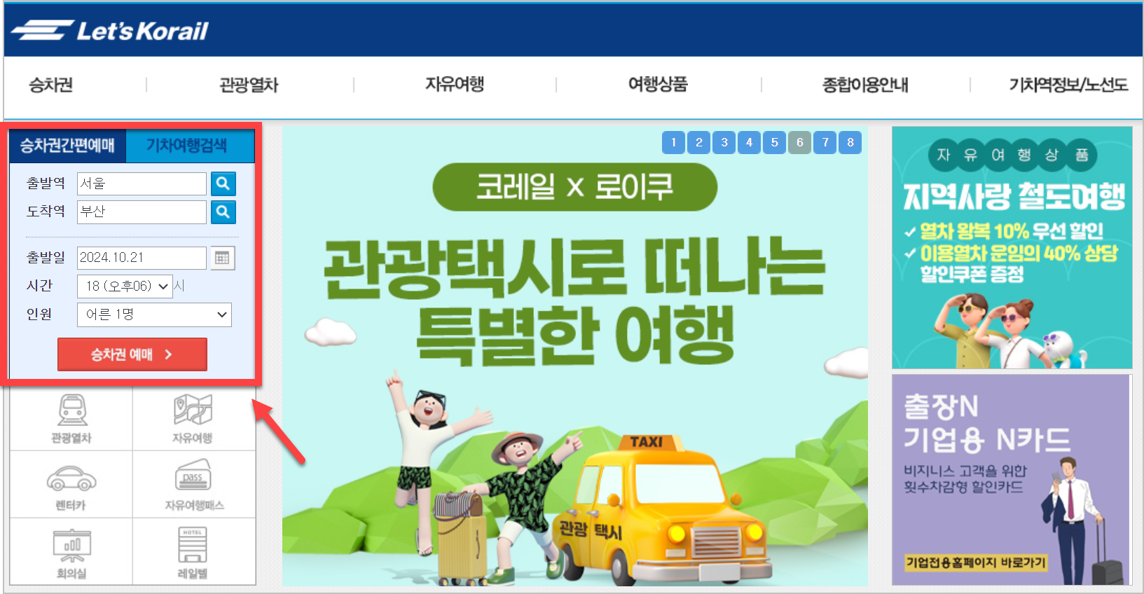 1) 좌측을 보시면 승차권 간편예매라고 되어 있습니다. 여기에 입력을 하고 나서 붉은색 박스를 클릭합니다.