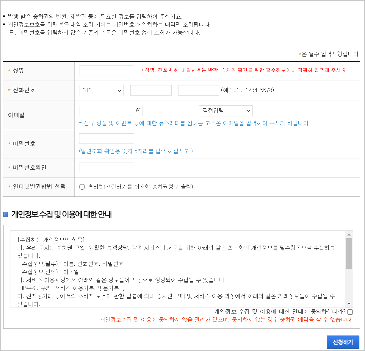 4) 성명 이름 등 기본적인 정보를 입력합니다. 이후에 하단에 있는 신청하기를 클릭하시면 됩니다. 전화번호는 본인인증이 없습니다. 그렇기 때문에 여러번 확인하길 바랍니다.
