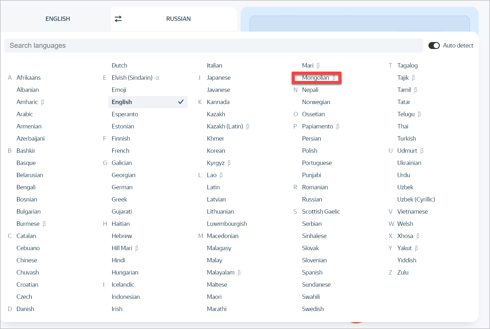 얀덱스는 러시아의 대표적인 검색 엔진이자 서비스 제공자로, 러시아판 구글로 불리기도 합니다. 이 서비스는 키릴 문자를 사용하는 몽골어와 러시아어 간의 변환에 강점을 가지고 있습니다. 구글보다 더 자연스럽고 정확한 번역을 제공하는 경우도 있으며, 특히 러시아와 몽골의 문화적, 언어적 유사성 덕분에 이 두 언어 간의 변환에서 더욱 뛰어난 성능을 발휘할 수 있습니다. (아직 베타버전입니다)