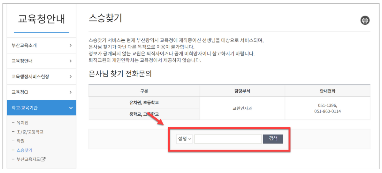 여러 지역 교육청에는 선생님을 찾을수 있는 서비스를 제공하고 있습니다. 서울도 있지만 부산에도 마찬가지로 있습니다. 부산교육청 스승찾기라는 이름으로 되어 있더라구요