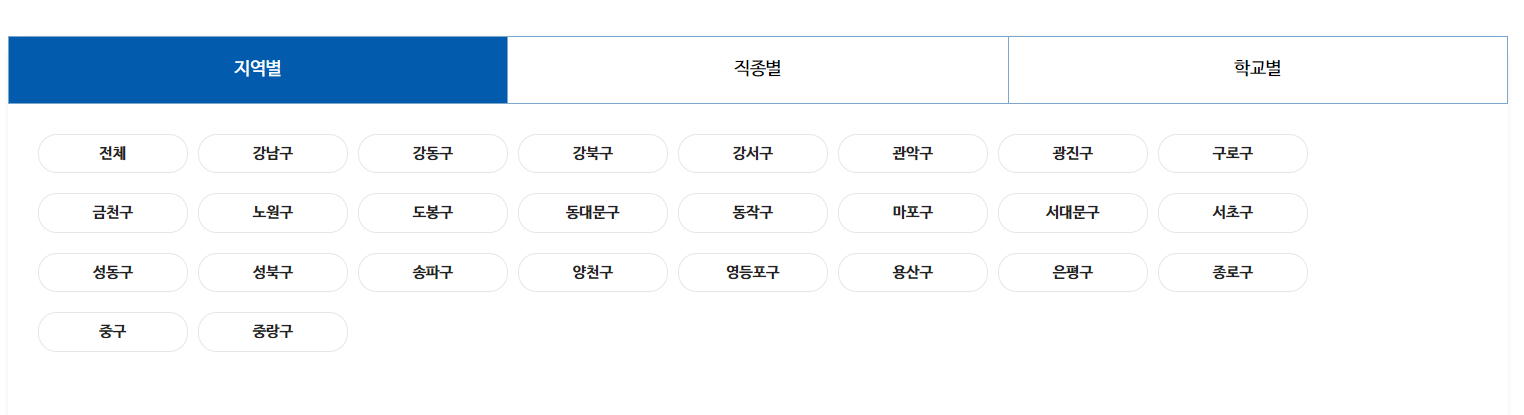 홈페이지에 방문하시면 위와 같이 세부 지역별로도 구분이되어 있고, 직종별로도 구분이 되어있습니다.