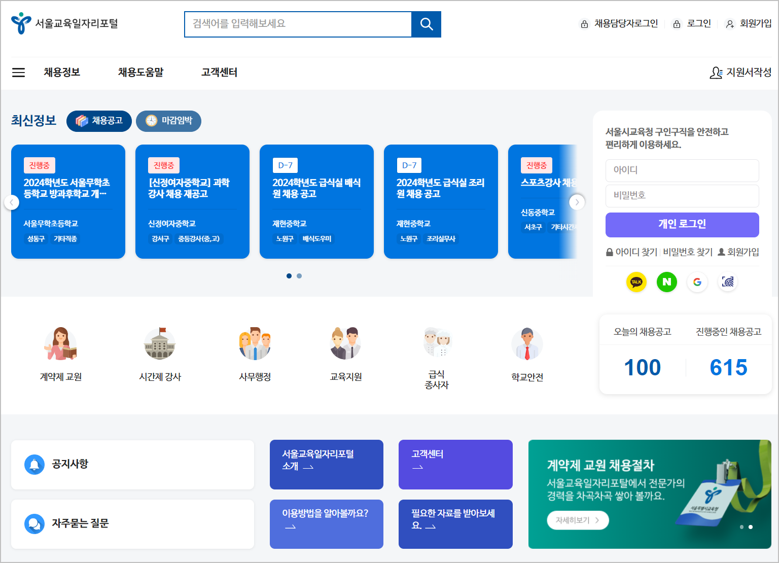 서울시 교육청 구인구직 사이트는 이제는 게시판을 운영하는 방식이 아니라 포털을 운영하는 방식으로 운영이 되고 있습니다.