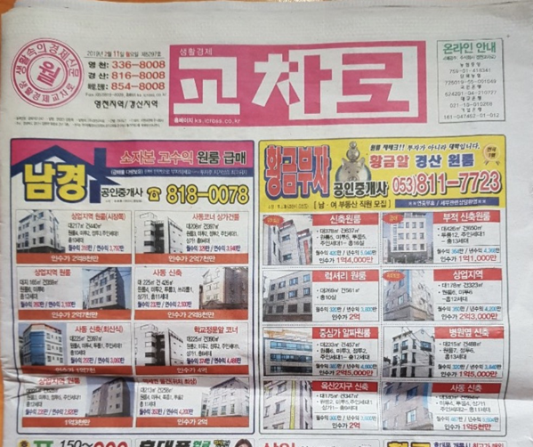 아시다시피 교차로 신문은 우리나라에서 가장 유명한 생활정보지 중 하나입니다. 1989년에 대전에서 처음 창간된 신문으로, 대덕 테크노밸리의 연구소에서 일하던 사람이 실험기기를 구하기 위해 서울로 실험을 하러 가야 했던 상황에서 시작되었습니다. 그러나 놀랍게도 그 실험기기는 자기 연구소 바로 옆 건물에 있었습니다. 이 사건을 계기로 지역 정보지를 만들게 되었다고 합니다.