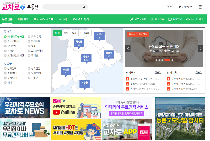 특히 부동산 정보를 찾는 사람들에게는 꽤 유용한 메뉴가 마련되어 있습니다. 상단 메뉴에서 부동산 항목을 선택하면 순천 지역의 매물 정보나 거래 정보를 확인할 수 있습니다. 화면 구성은 예전 포털 사이트의 부동산 서비스와 비슷한 느낌을 주기 때문에 처음 이용하는 사람도 어렵지 않게 사용할 수 있습니다. 지역 중심으로 정리된 정보가 많기 때문에 순천이나 광양 지역의 부동산 상황을 살펴볼 때 참고할 만한 사이트라고 볼 수 있습니다.