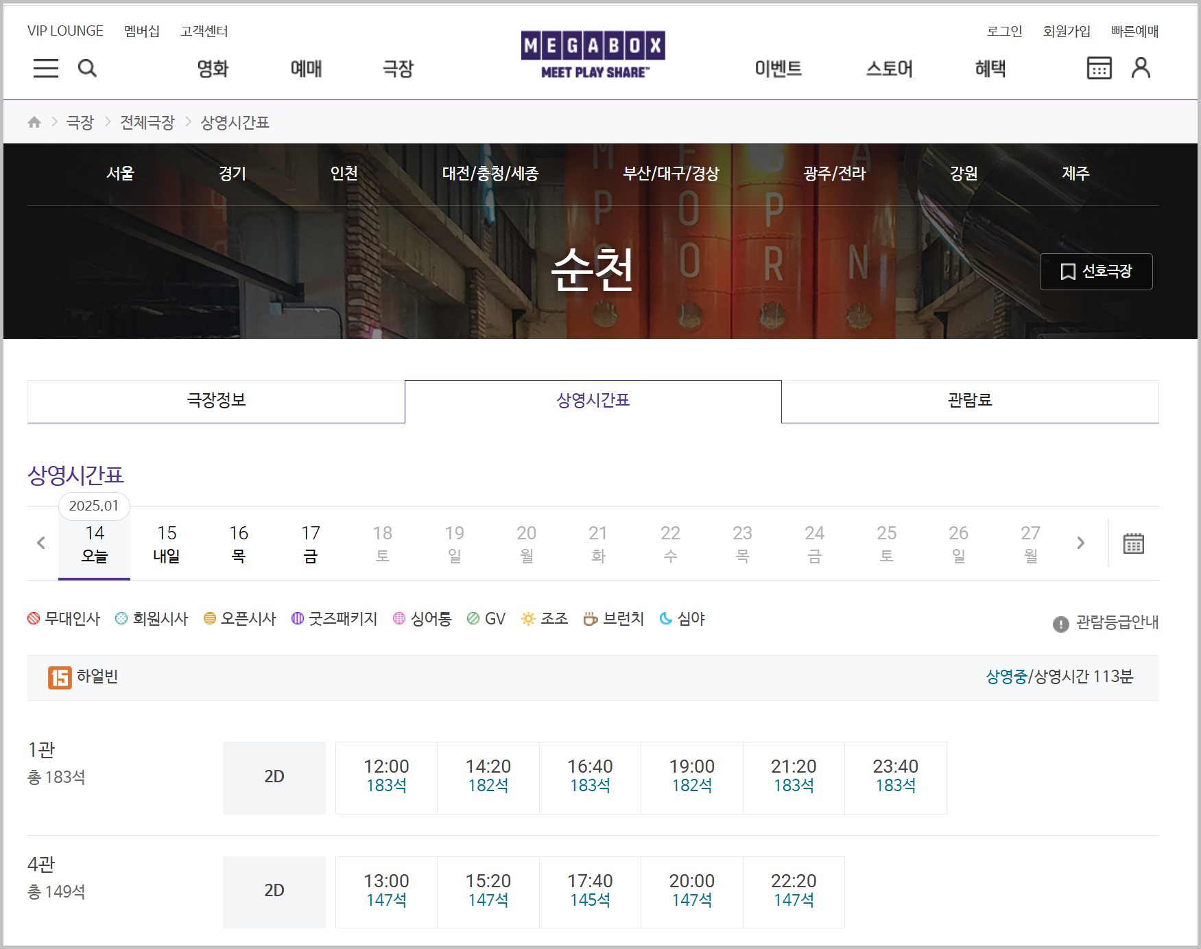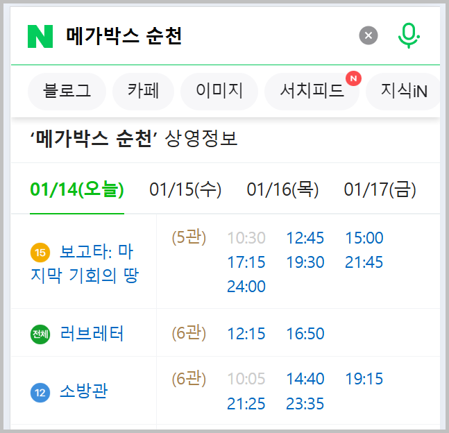 검색어를 입력을 할때 주의해야하는것이 있습니다. "순천 메가박스"라고 검색을 하게 되면 영화관의 위치가 나오게 됩니다. 반대로 '메가박스 순천'이라고 입력을 해야지 제대로 상영시간표가 나오게 됩니다. 이점을 유의하면 됩니다.