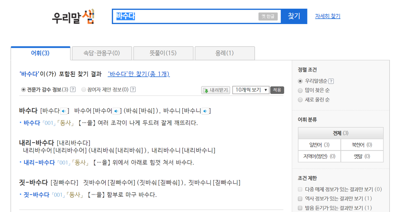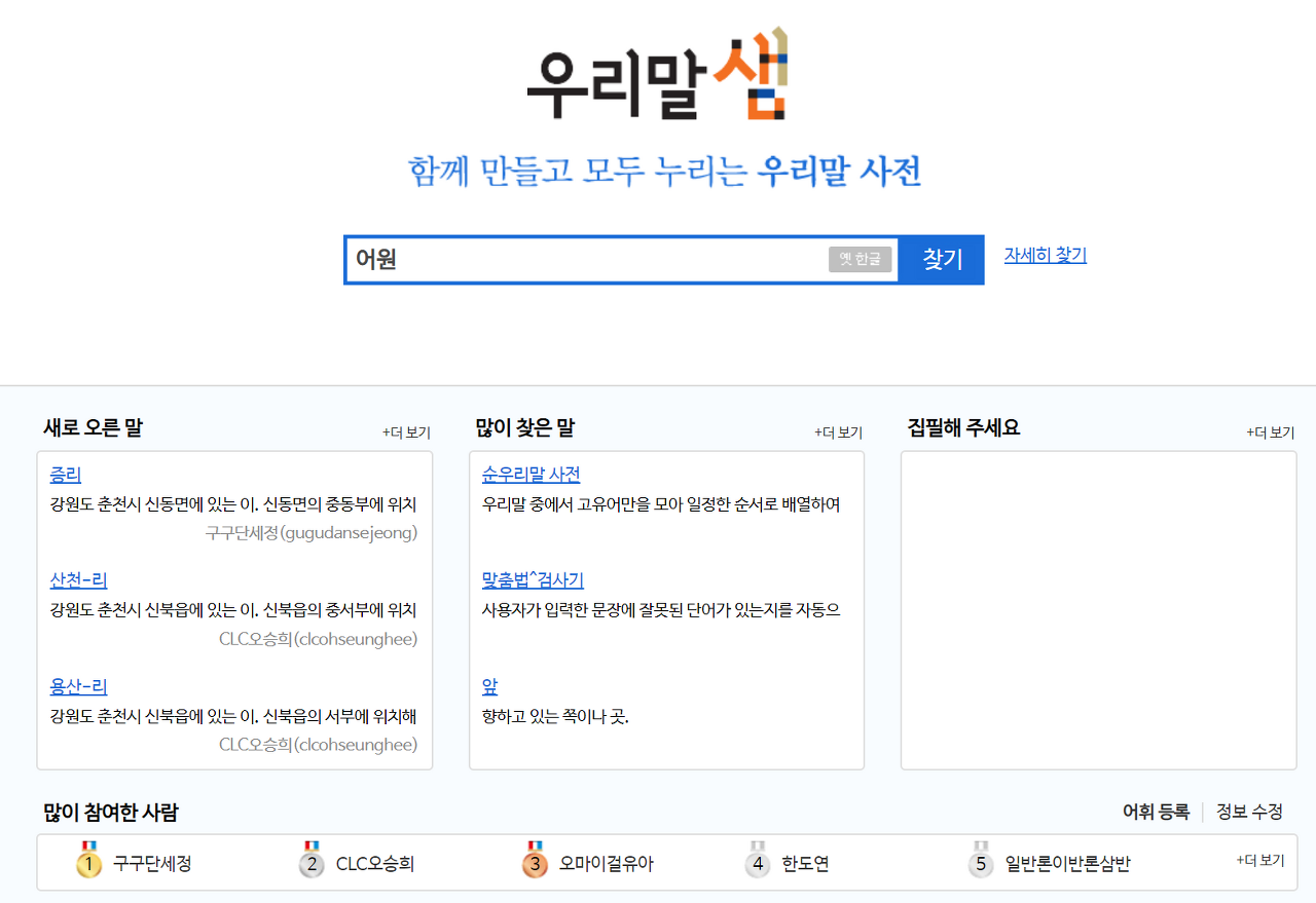 국립국어원에서 제공하는 국립국어원의 우리말샘은 순우리말을 포함해 다양한 국어 정보를 제공하는 온라인 사전입니다. 단순한 뜻풀이뿐 아니라 용례와 어원 정보도 함께 확인할 수 있습니다. 다만 이 사전은 전문가뿐 아니라 일반 이용자도 참여해 내용을 보완하는 구조이기 때문에, 일종의 위키형 사전으로 이해하는 것이 좋습니다. 예를 들어 요즘 거의 쓰이지 않는 ‘바수다’ 같은 표현도 검색이 가능하며, 의미와 활용 예를 확인할 수 있습니다.