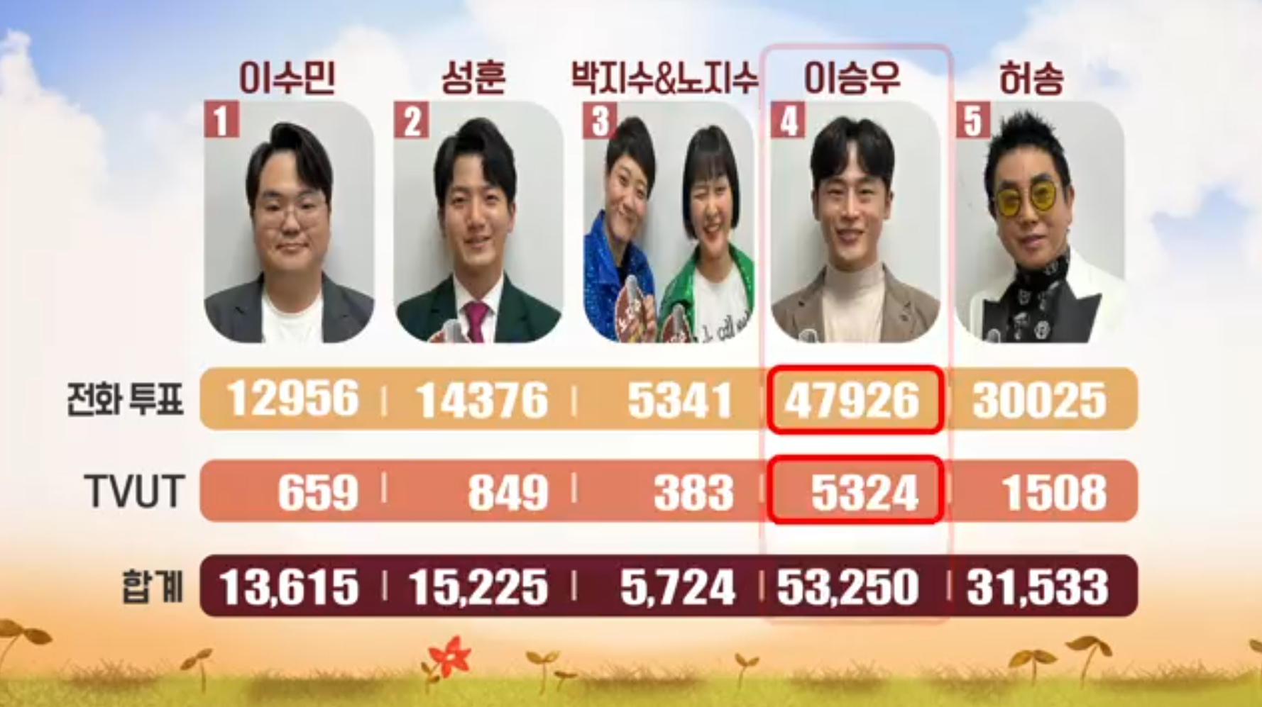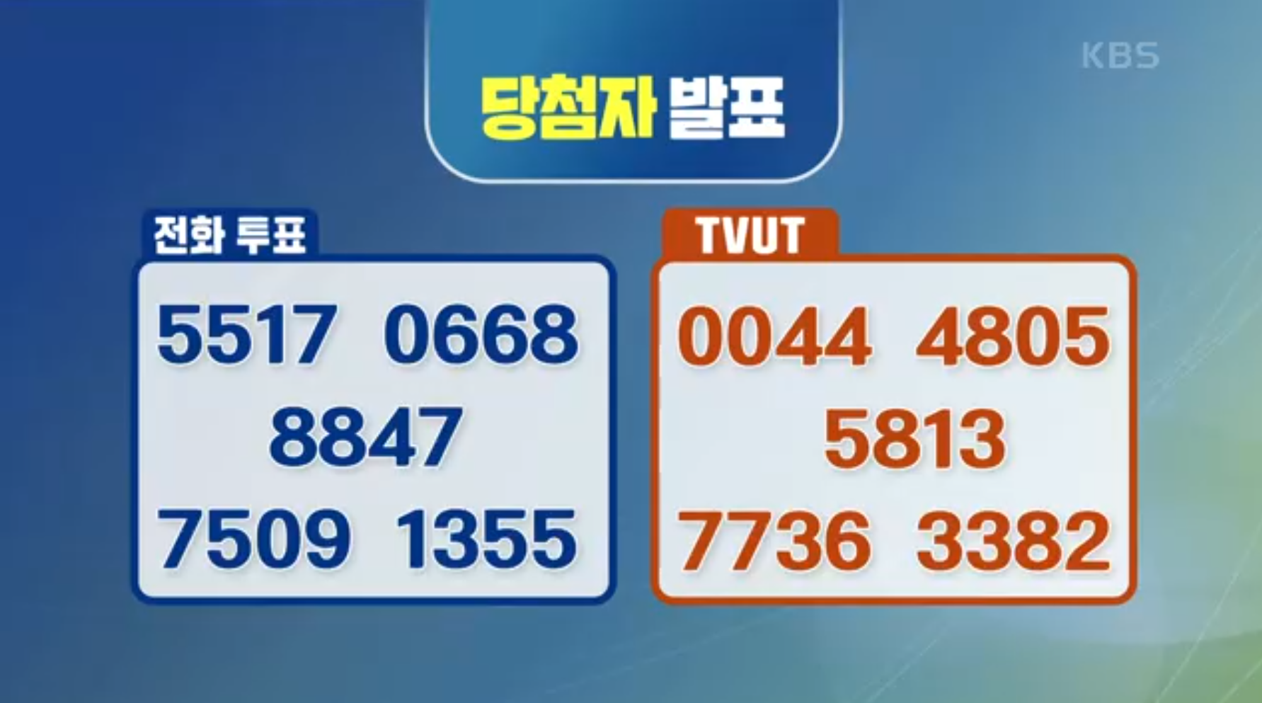 보시면 알겠지만 전화투표를 하는 사람의 숫자가 압도적으로 많습니다. 오직 7%만 TVUT으로 응모를하고 93%는 전화투표를 하고 있습니다.