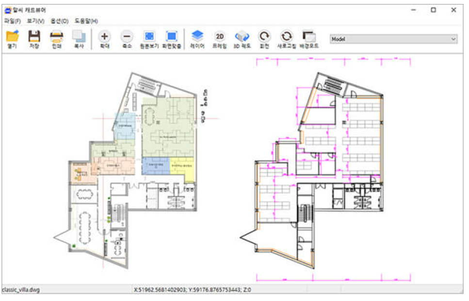 알씨만 있다면 위와 같은 캐드뷰어를 이용할 수 있습니다. 뷰어는 뷰어일 뿐이기 때문에 많은 기능이 존재하지 않습니다. 가능한 대표적인 기능은,