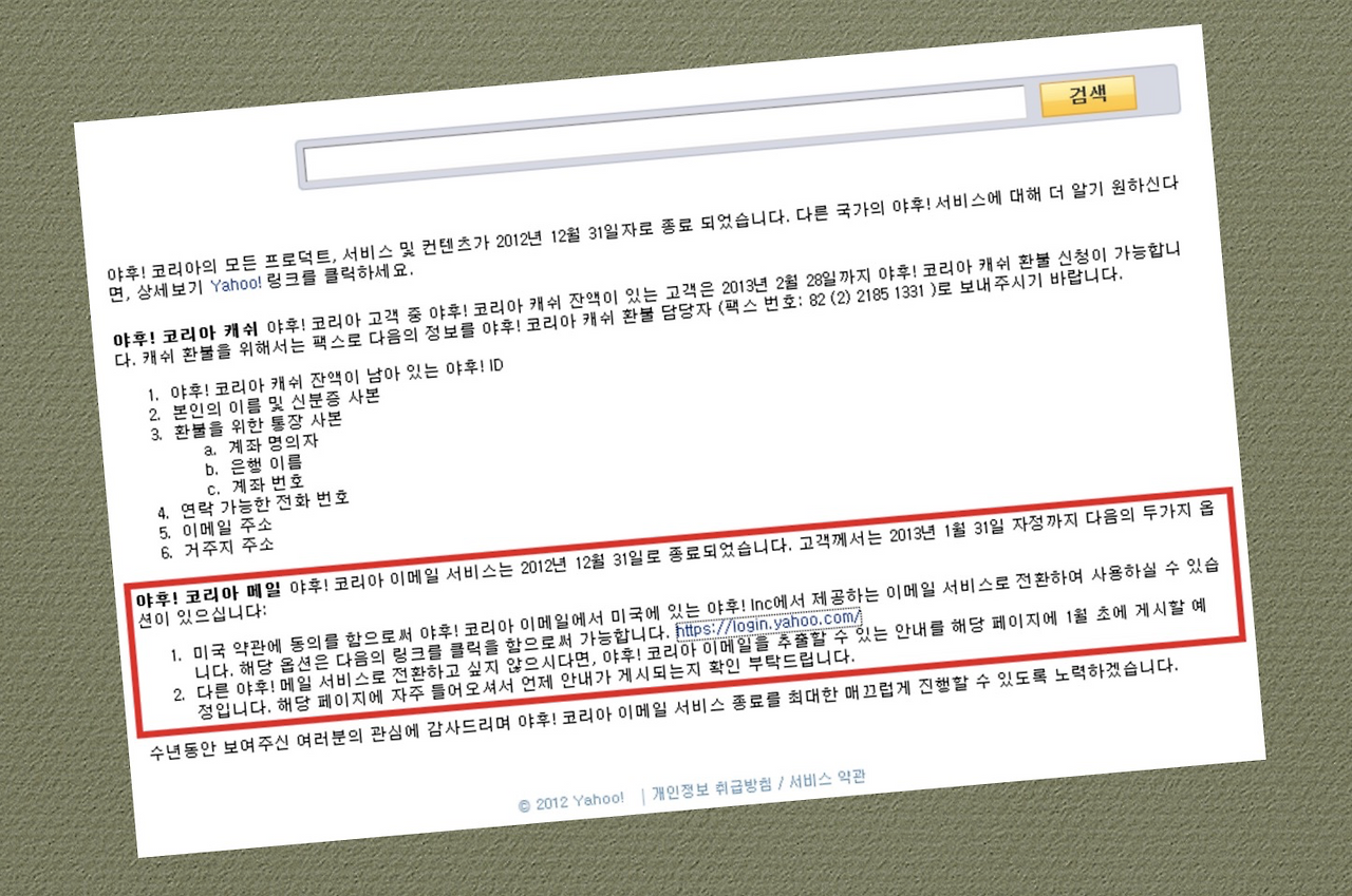 결국 야후코리아는 2012년 12월 31일을 끝으로 한국 서비스를 종료하게 됩니다. 이로 인해 야후코리아 사이트도 더 이상 운영되지 않게 되었습니다. 그래서 과거에 yahoo.co.kr 주소를 사용하던 메일 서비스 역시 더 이상 한국에서 직접 운영되지 않게 되었습니다.
