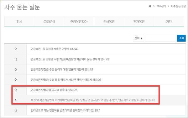 위 표를 살펴보면 1등과 2등 당첨금은 일시금으로 받을 수 없습니다. 대신 3등부터는 일시금으로 수령이 가능합니다. 그러나 이 금액 자체가 크지 않아서 크게 상관 없을 것 같습니다. 이 내용은 홈페이지 FAQ에도 간단히 설명되어 있습니다. FAQ를 확인하려면 아래 링크로 이동하세요.