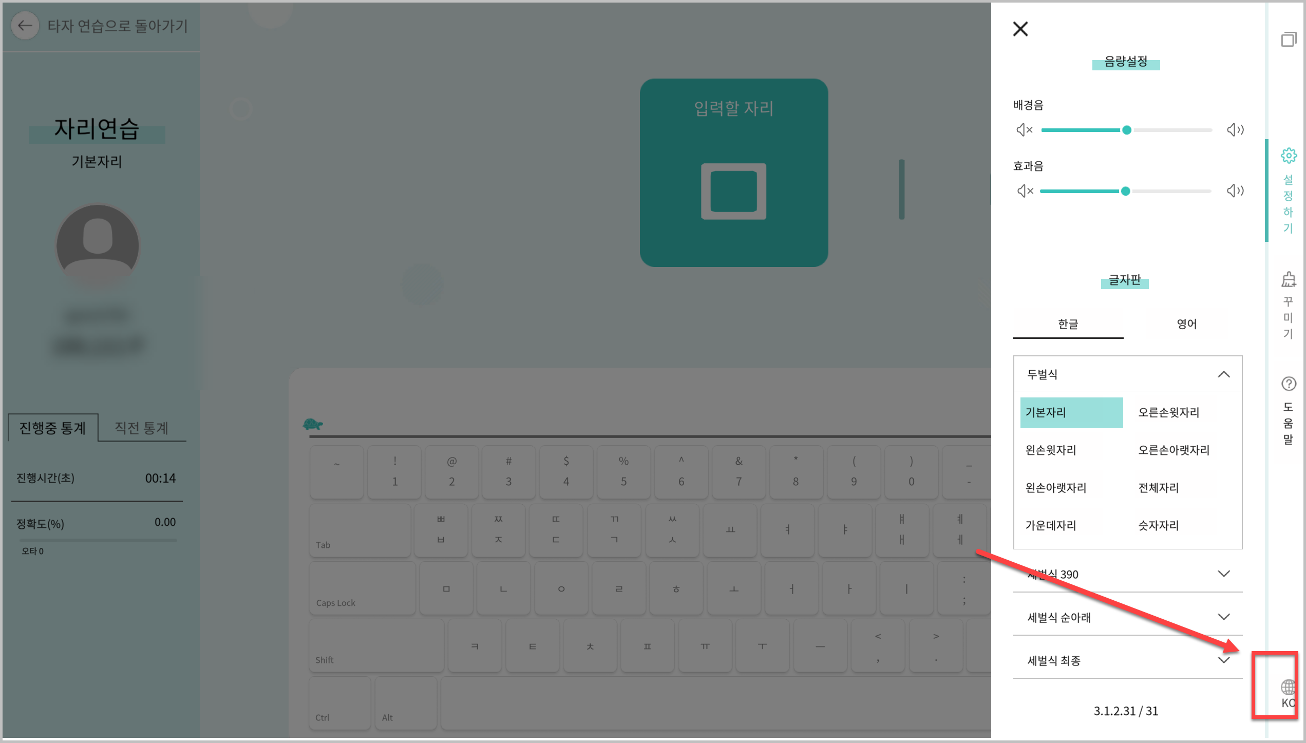 찾기 어려운 사람이 많을텐데 오른쪽 아래를 보면 언어 설정을 할수있도록 되어 있습니다. 위 화면은 설정하기를 누르면 나오는 겁니다. 여기서 공부할 자판도 바꿀수 있습니다. 하다보면 금방 배울수 있습니다. 인터페이스도 좋기 때문에 그새 익숙해지고요