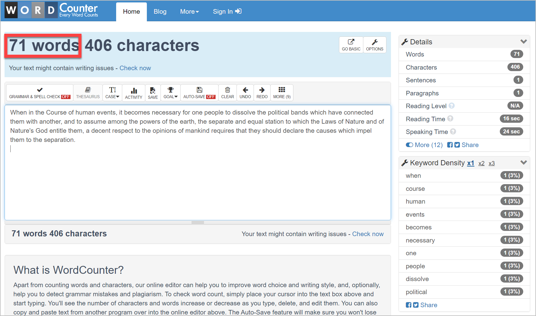 Word Counter 라는 사이트를 이용하면 됩니다.구글에서 word counter라고 검색을 하시면 나오는 첫번째 것을 들어가시면 됩니다. 해외의 유수의 사이트에서도 이것을 추천하더라구요.