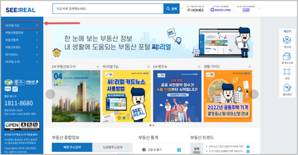 링크로 들어가면 위와같은 첫 화면을 볼 수 있습니다. 좌측 메뉴를 살펴보면 "씨:리얼지도"라는 항목 보입니다. 이 항목이 과거의 온나라지도와 동일한 역할을 합니다.