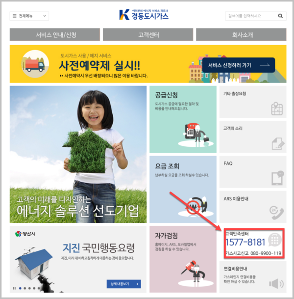 경동 도시가스는 울산 지역과 인근 양산 지역에서 공급을 담당하고 있습니다. 회사 홈페이지를 검색해서 들어가면 아래와 같은 화면을 볼 수 있습니다. 그리고 화면 하단부에는 고객만족센터 전화번호를 볼 수 있습니다. 제가 이미 아래에 알려드렸으니 따로 홈페이지에 접속할 필요는 없을것 같네요.