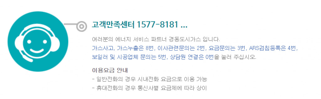 위 전화번호로 연락하면 고객센터에 연결됩니다. 이 때, ARS(자동 응답 시스템)으로 연결되며, "가스사고, 누출은 1번, 이사 관련은 2번, 요금 문의는 3번, ARS 검침 등록은 4번, 보일러 및 시공업체 문의는 5번, 상담원 연결은 0번을 눌러 주십시오"라는 안내 음성을 듣게 됩니다. 이때 적절한 번호를 눌러 원하는 정보나 서비스를 얻을 수 있습니다.