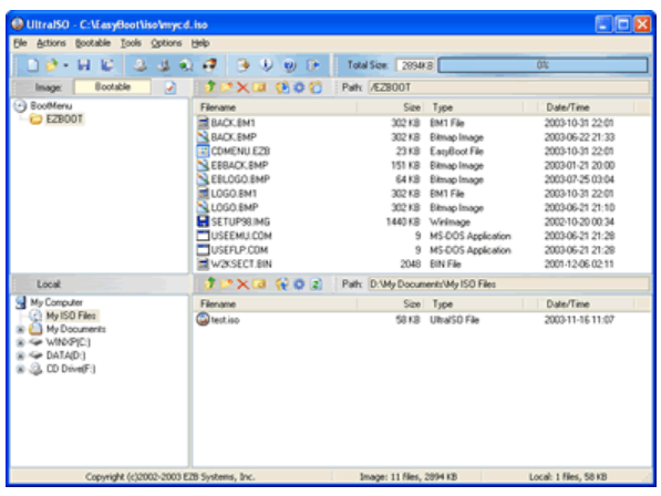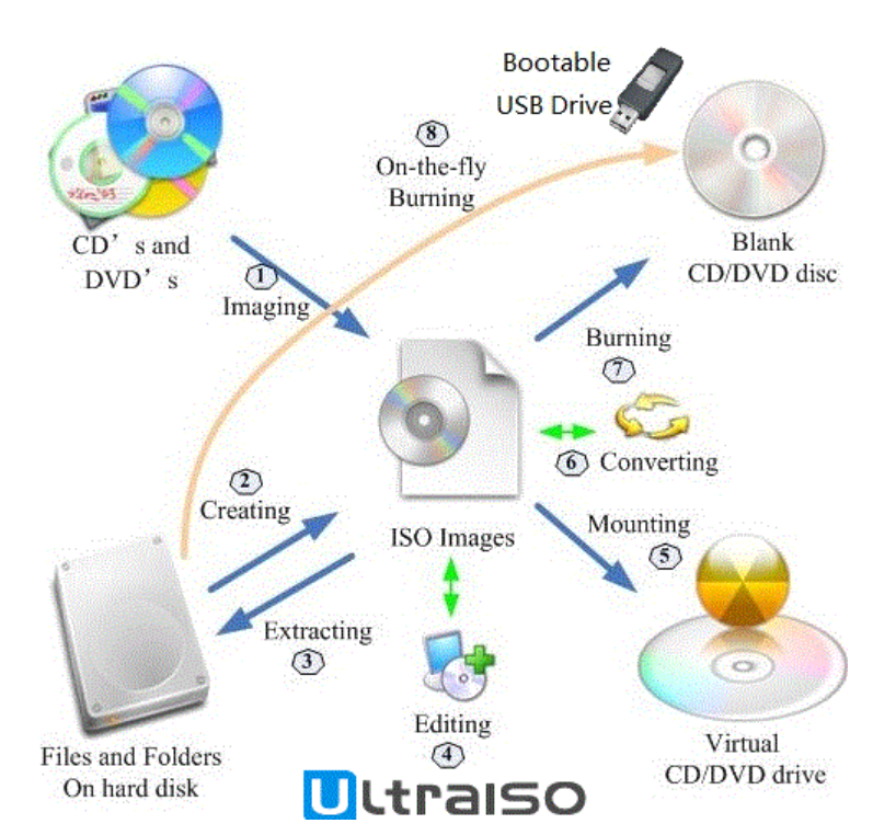 울트라 iso를 사용하면 ISO 파일을 CD/DVD-ROM에 구을수 있습니다. 부팅 가능한 CD/DVD를 만들 수도 있습니다.