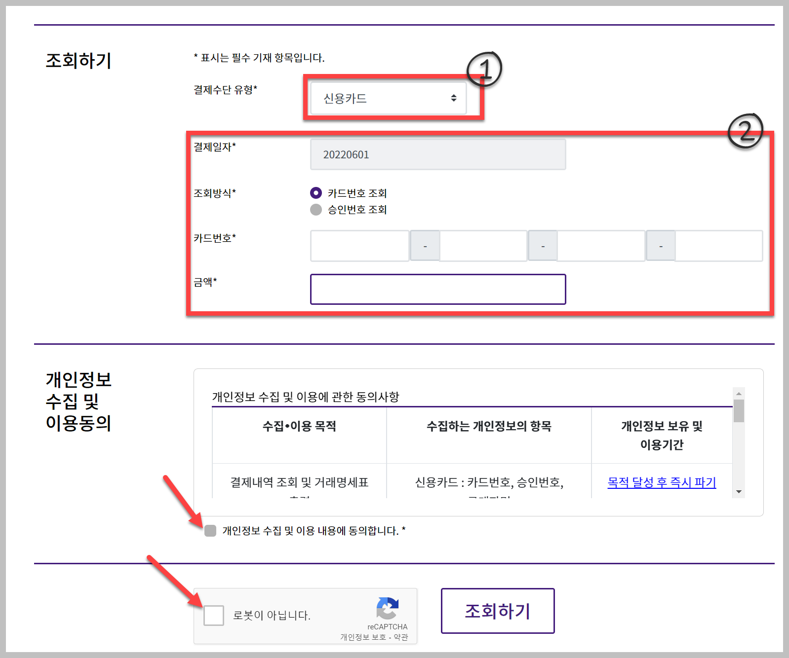 이것만 입력을 하고 개인정보 수집과 로봇이 아닌것을 인증해주면 쉽게 어디에서 결제를 했는지 알려주게 됩니다.