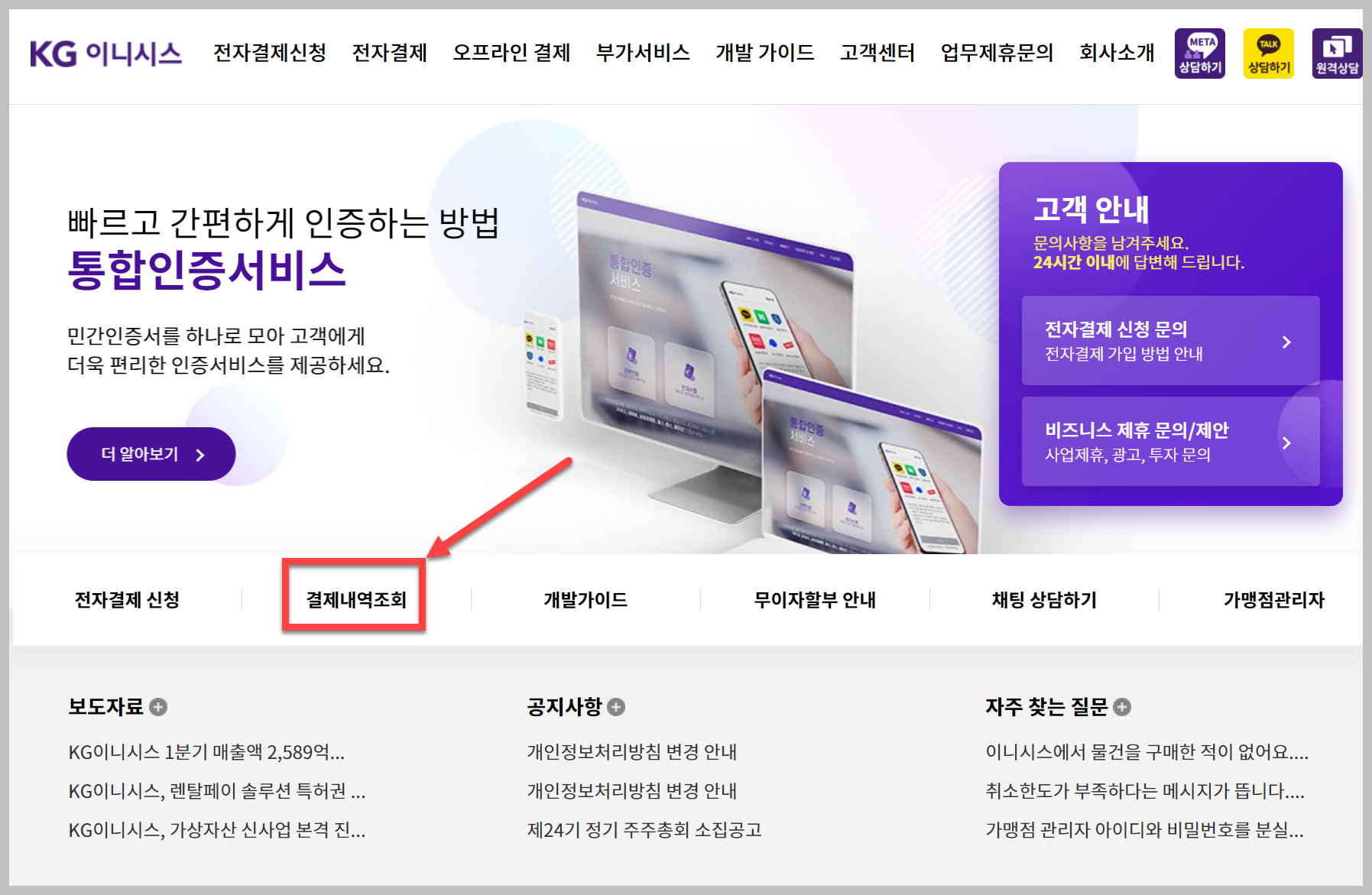 일단 이니시스 홈페이지로 들어가야겠지요. 대부분의 이러한 문제는 해당 홈페이지로 들어가면 쉽게 해결이 됩니다. 이 홈페이지에 들어가면 아래와 같은 화면이 나오게 됩니다.