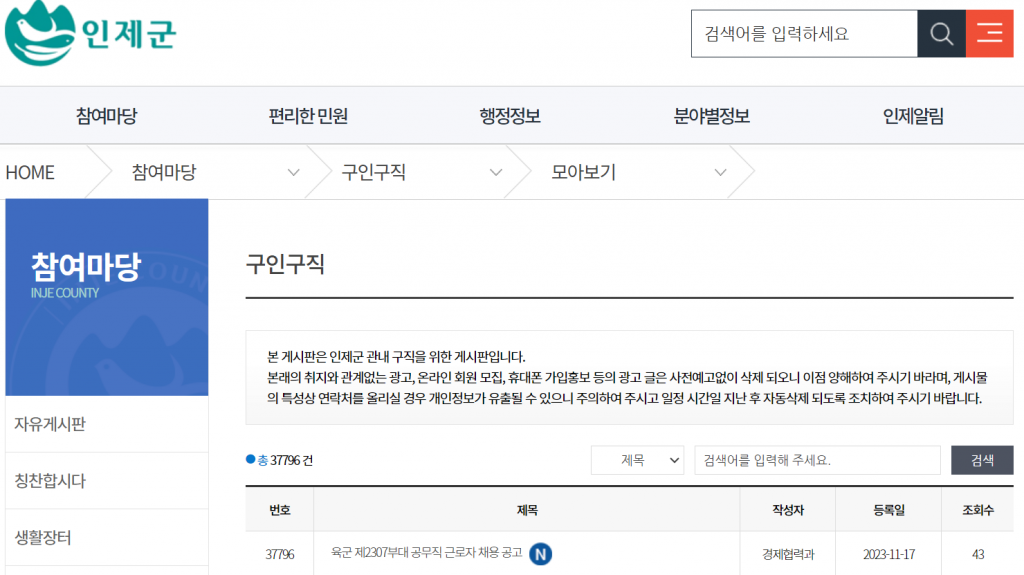 인제군청 뿐만 아니라 다른 지방 자치 단체에서도 구인게시판을 운영하는 경우가 많습니다. 이러한 게시판은 군청 공무원이 직접 관리하므로 품질이 높은 정보가 많이 있습니다. 따라서 일자리를 찾고있다면 한번쯤 방문해보는 것을 추천합니다.