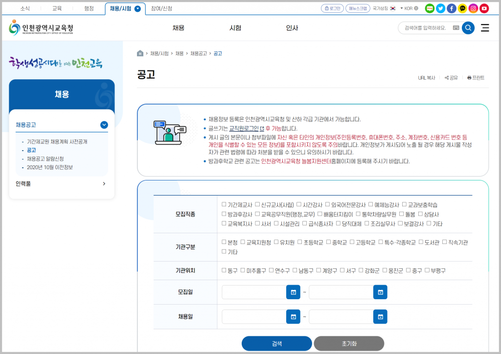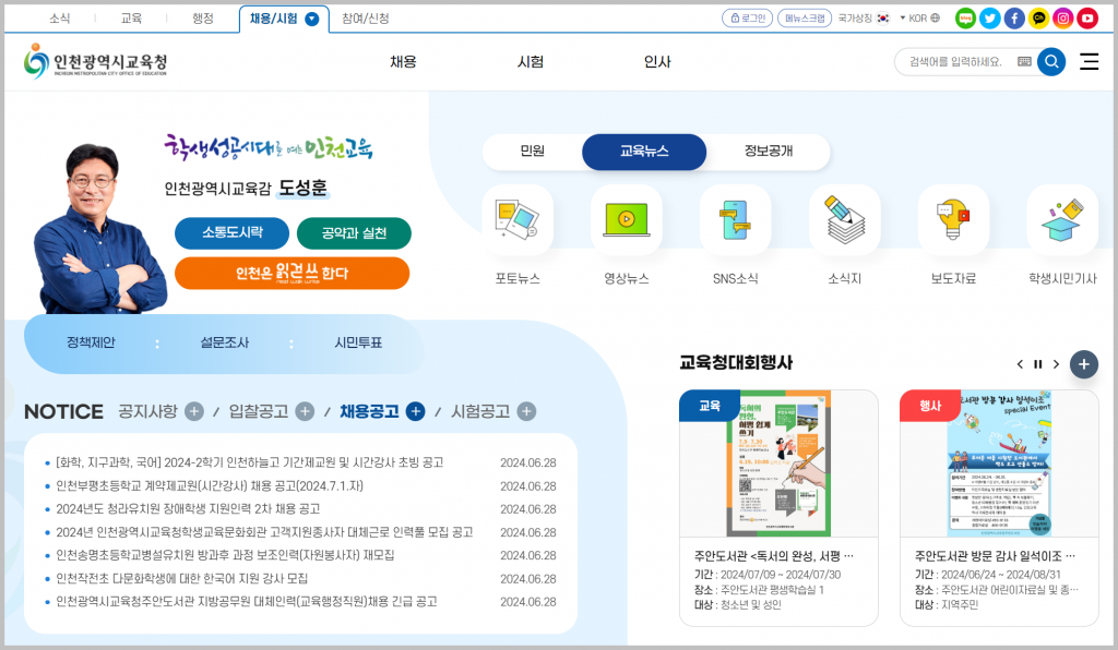 이번 포스팅은 인천시교육청 구인구직 게시판에 대한 것입니다.일자리를 구하는데 있어서 많이 알려지지 않은 사이트입니다. 우선적으로 인천교육청 홈페이지에 가면 다양한 서비스를 찾 볼 수 있습니다.