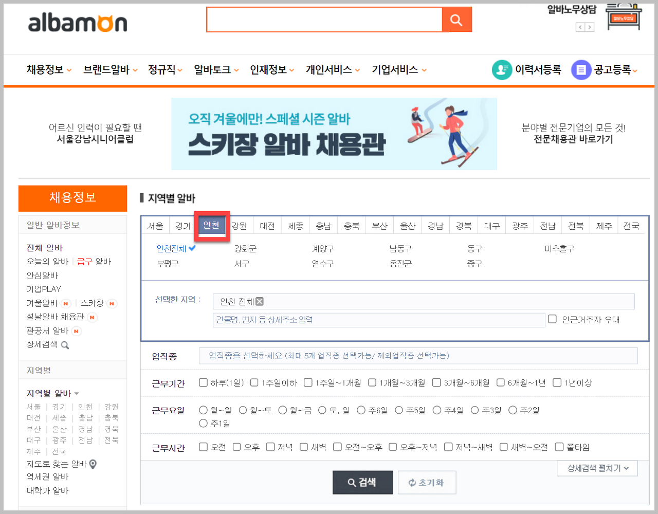 알바몬 홈페이지에서 인천을 클릭해도 해당 동네의 일자리만 필터링해서 볼 수 있습니다. 하지만 이렇게 보는 것보다 더 편리한 방법이 바로 인천알바몬 홈페이지 입니다.