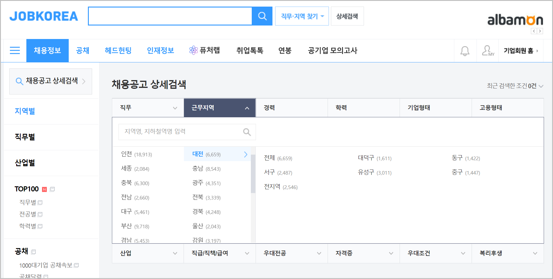 대부분의 구인구직 사이트와 마찬가지로 잡코리아 역시 지역별 사이트를 별도로 운영을 하고 있습니다. 지역별 사이트라고해서 일반 사이트와 얻을 수있는 정보가 다른것은 아닙니다. 조금더 편리하게 접근하기 위하여 이런 사이트를 만든것일 뿐입니다. 대전지역의 경우에는 잡코리아 대전으로 접속을 하시면됩니다.