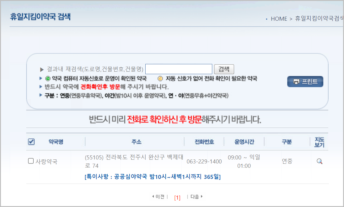 심야약국검색에 마우스를 누르면 위와 같이 심야약국을 검색할수 있는 창이 나오게 됩니다. 여기에서 전라북도와 전주의 심야 약국을 검색할 수 있습니다.