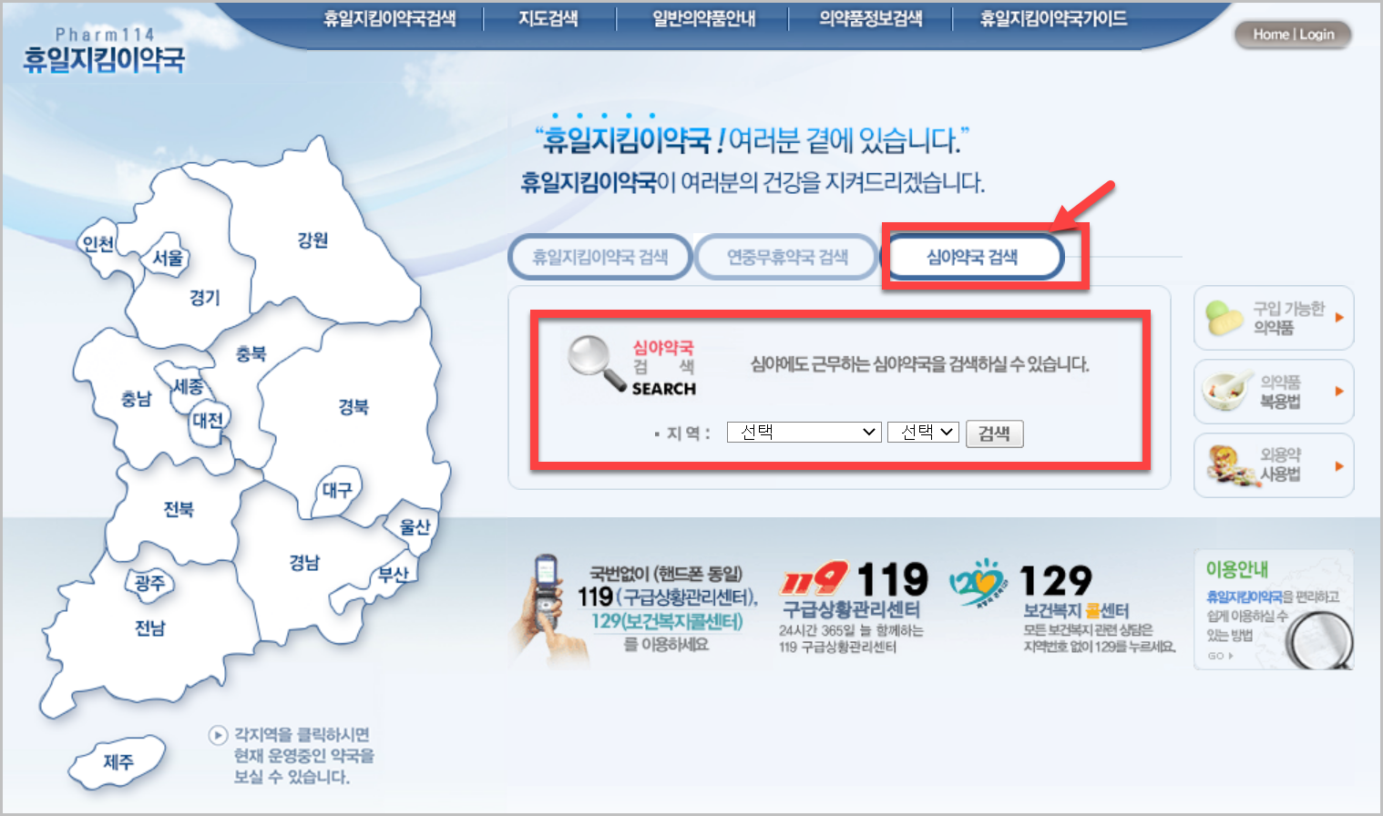 가끔 홈페이지가 먹통인 경우가 있어서 홈페이지 첫화면에서 검색이 안되는 경우가 있습니다. 그럴때는 메뉴에서 '휴일지킴이 약국검색'으로 들어가서 '심야약국 검색'을 하시면 됩니다. 오류가 있는데 이게 잘 안고쳐지는것 같기도 하더라구요/