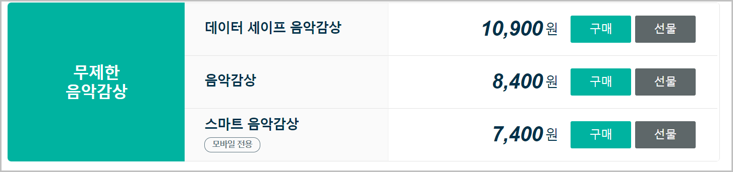 지니 스마트음악감상이 가장 가격이 저렴합니다. 가격이 저렴하다는것은 기능이 가장 떨어진다는것이겠지요. 오직 스마트 기기에서만 음악을 들을 수 있는 요금제 입니다.