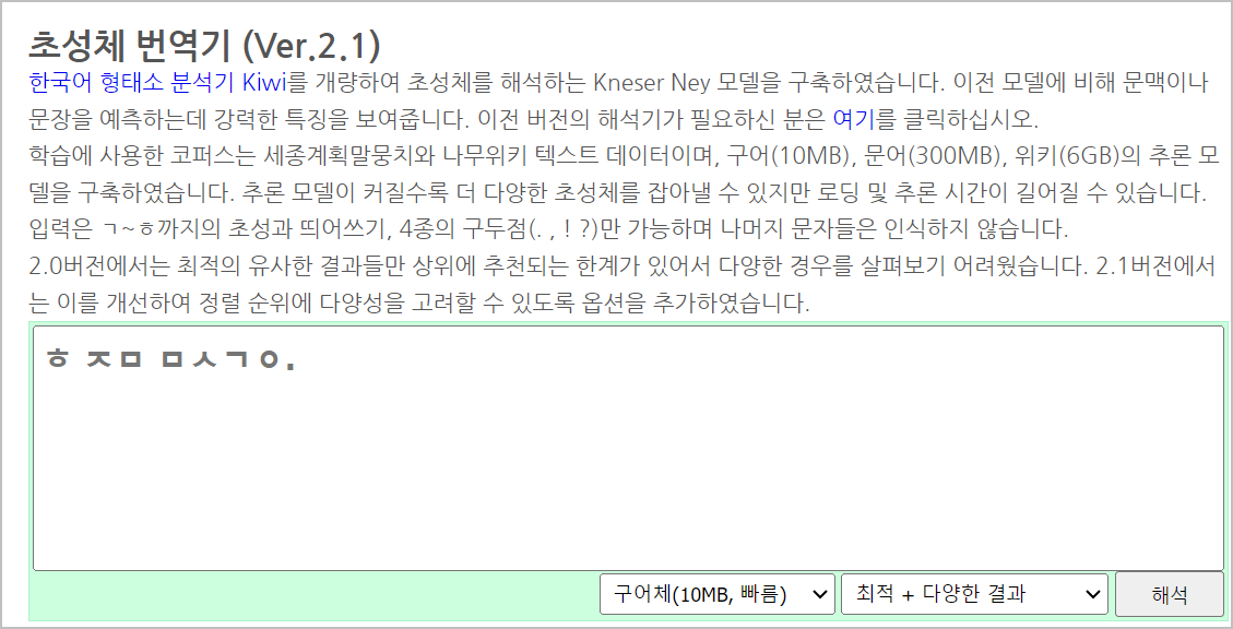 번째는 'ILAB 초성체 번역기'입니다. 이 사이트는 한국어 형태소 분석기를 기반으로 하여 보다 전문적인 기능을 제공합니다.