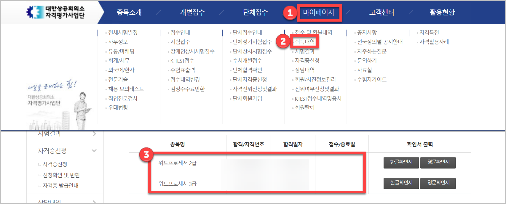 홈페이지에 들어가면 위와 같은 화면이 나오는데, 로그인을 하고나면 간단하게 취득내역을 확인할 수 있습니다. 본인인증이 완료된 다음에는 1) 마이페이지 2) 취득내역으로 들어가시면 위와 같이 내용을 확인할 수 있습니다.