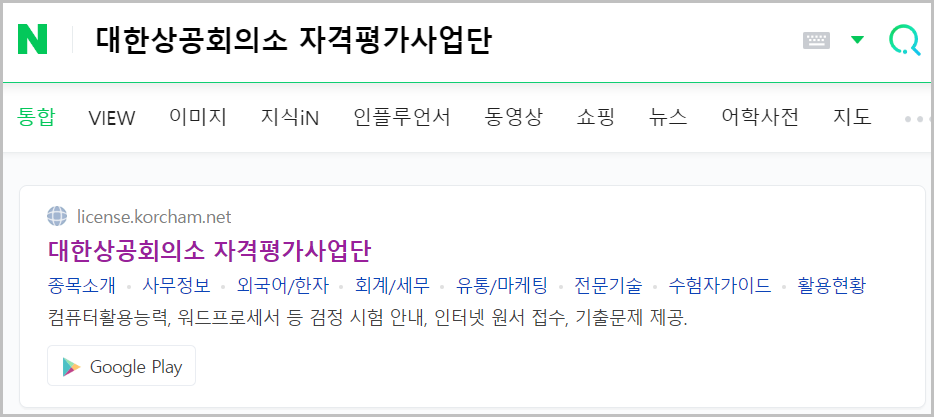 과거에 이 시험에 패스한 사람의 경우에는 간단하게 컴퓨터활용능력 자격증 조회가 가능합니다. 위 화면처럼 '대한상공회으소 자격평가사업단' 이라고 검색을 하거나 '대한상공회의소 자격증조회'라고 검색을 하시면 가장 맨위의 검색결과를 클릭하시면 됩니다.